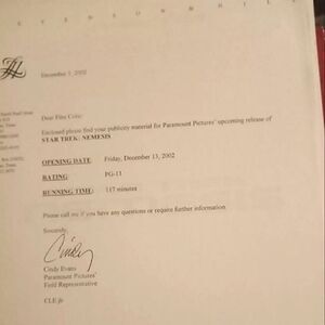 Star Trek Nemesis Handbook Of Production Information, letter of release date.