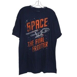 Star Trek The Final Frontier Mens T-Shirt in Blue Navy, Size XL. Made from 100% cotton with a crew neckline and short sleeves. The graphic tee features a Star Trek design. Manufactured between 2010-2019. Machine washable.