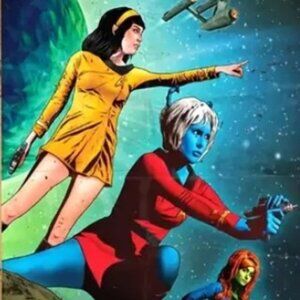 Celebrate the fierce women of *Star Trek* with this bold 8"x12" vintage-style metal sign featuring a retro comic-book inspired space scene. This powerful artwork showcases a trio of interstellar heroines—including a classic yellow-uniformed officer, a striking blue Andorian in red, and a green-skinned Orion crew member—all standing strong against a cosmic backdrop. Above them, the USS Enterprise flies confidently through the stars, symbolizing the spirit of exploration and unity that defines the Federation.