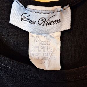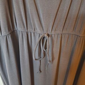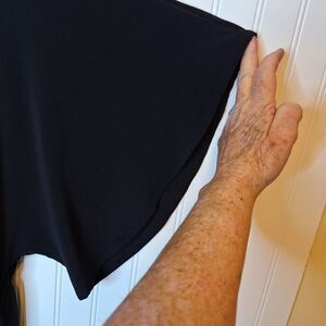 Black, flutter sleeves, scoop neckline, elastic waist with non functional drawstring tie, length sits at or below knee length depending on your height