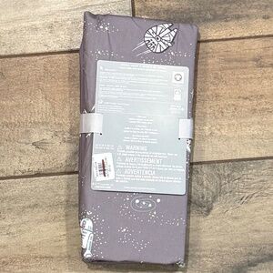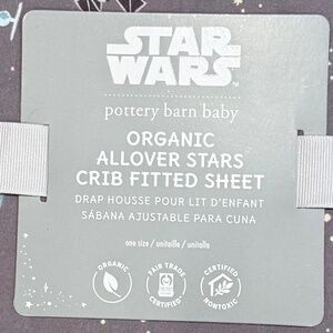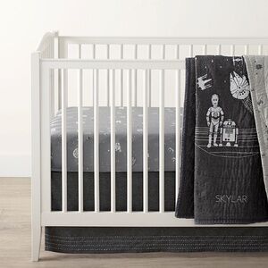 Add epic style to your Padawan’s bedding. This Star Wars Crib Fitted Sheet features iconic print of the Millennium Falcon, TIE fighters , the Death Star and their favorite characters across a starry sky. It’s woven from pure organic cotton percale for a durable, cozy sleep space. This Star Wars nursery collection is designed exclusively for Pottery Barn Kids.