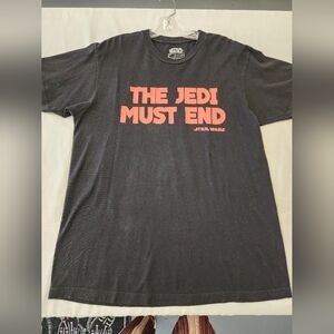 This short sleeve tee from Fifth Sun features a bold red 'The Jedi Must End' graphic on a black background, offering a striking contrast. Crafted for fans of the iconic Star Wars series, this shirt offers galactic levels of comfort. 100% COTTON. Made in Mexico. Machine wash cold.