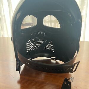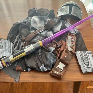 Darth Vader helmet and Mandalorian costume with lightsaber.