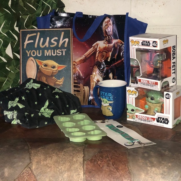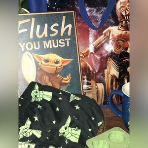 These black sweatpants are perfect for lounging or sleeping, offering a comfortable fit with their elastic waistband. The soft fleece ensures a cozy feel, making them an ideal choice for relaxation and fans. Fandom merch. Fleece with an elastic waistband. Excellent condition includes new ceramic mug, two funko pops, tin sign, lanyard with a small keychain, a tote bag and silicon ice cube tray.