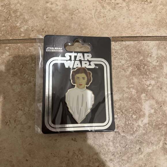 Star Wars Celebration Anaheim 2020 exclusive Limited Edition Princess Leia enamel pin. This collectible pin features Princess Leia in her iconic white gown and buns hairstyle, designed in a classic Star Wars retro style. The pin is new and still sealed in its original packaging, making it a perfect addition for any Star Wars fan or Disney pin collector. Released as part of the Star Wars Celebration 2020 Anaheim event merchandise.