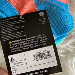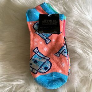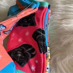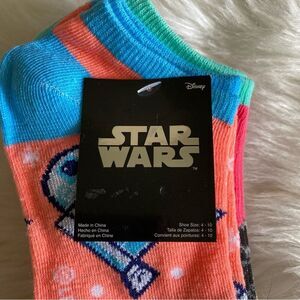 6 pack of Star Wars characters socks. Includes metallic R2D2, Darth Vader, C-3PO, Princess Leia, stormtroopers, Ewoks. Very colorful: teal, neon pink, coral, blue, bright pink and more.