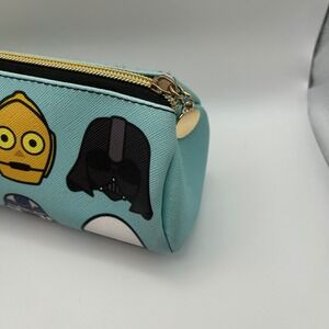 Adorable Star Wars themed pencil case, perfect for storing pens, pencils, makeup, or other small accessories. Featuring a playful design with stylized versions of Chewbacca, an Ewok, C-3PO, Darth Vader, Boba Fett, the Rebel Alliance symbol, R2-D2, and a Stormtrooper helmet on a light blue background. With a gold-tone zipper and a smooth, lined interior, this pouch combines functionality with a touch of fandom.