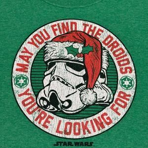 Green Mens Star Wars Graphic T-Shirt Featuring a Stormtrooper in a Santa Hat with the Text “May You Find the Droids You’re Looking For.” Printed on a 50/50 Cotton-Poly Blend. Tagless, Lightweight, Soft.