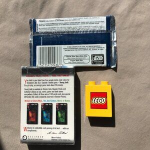Star Wars Collectable bundle-Topps card, Lego, & Card game. Please see photos for more information and condition. Topps cards and card game are unopened. Photos taken in natural light.