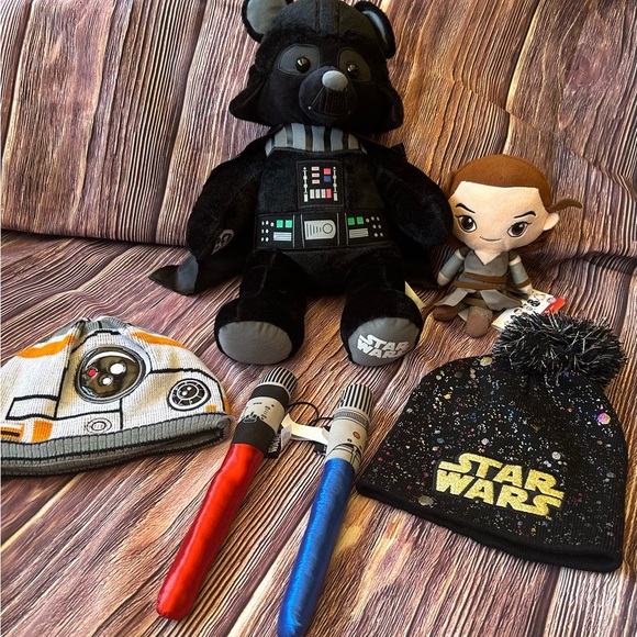 SOLD. Cute collection! Build-a-Bear, 2 beanies, 2 material mini light sabers.