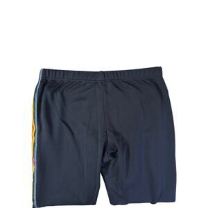 These pants are dark blue with multicolored stripes down the outside of each leg. Near the bottom of the right leg there is a Millennium Falcon on the stripes. The waistband is elastic and quite stretchy. There is a pocket on each side.
