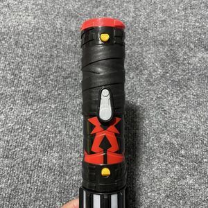 Sculpted black and red hilt with Darth Maul-inspired graphic details and yellow button accents