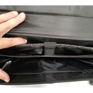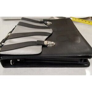 The briefcase Darth Vader carries to meetings with his officers features a top handle shaped like Vader's lightsaber hilt and a removable shoulder strap with pad (adjusts from 12"-23"). Vader's helmet and Star Wars logo are debossed on the front while the logo is also embossed on the shoulder pad. The bag includes a padded sleeve for your tablet or laptop organizer, a main compartment containing 2 open pockets, 3 pen loops, and a chain key fob. The bag's rigid flap with 2 tuck lock clasps closes over all interior sections Measures 16" wide x 12-1/2" tall x 2-1/4" deep (gusset allows bottom to expand to 4").