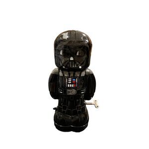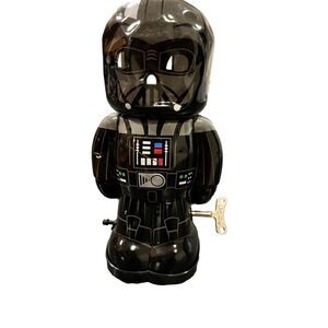 This is a pre-owned wind-up Darth Vader toy. It is made of metal and measures approximately 6 inches tall. The toy is black with a silver wind-up key on the back. The toy is in good condition with some noticeable dents, The paint is slightly chipped in a few places, and the wind-up key is a bit stiff. The toy still works and walks when wound up. The toy is a great addition to any Star Wars collection.