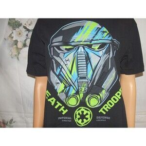 This is a Star Wars Death Trooper T-shirt in size M, designed for both men and women in a regular fit. The shirt features Lucas as the character from the Lucas Films Ltd, showcasing a black color with a themed design related to Star Wars and the Death Trooper character family. Perfect for fans of the Star Wars franchise, this unisex T-shirt offers a comfortable and stylish way to show off your love for the iconic series. This is a Fruit of the Loom 100% Cotton Shirt. This Shirt is in Excellent Gently worn condition. Perhaps it was worn a time or two tops. The shirt was checked over buy our crack team of Inspection Fairies and given their Two Wings Up Kiss of Approval (which means they found nothing at all wrong with it) so you can buy with confidence. Another fine item brought to you by the Fairies, we also will combine shipping with any of our other items to save you even more :)