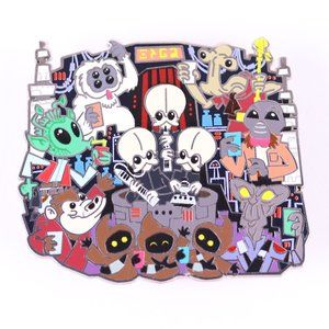 Part of the open edition series featuring Stylized Illustrations of the supporting characters in classic Disney films, this pin features a group from Star Wars.