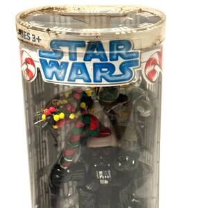 A Star Wars Galactic Heroes Holiday Multi-Pack, featuring Darth Vader, Boba Fett, and a Stormtrooper, all decked out in festive holiday gear. This collectible set includes miniature figures from the Star Wars saga, reimagined with holiday-themed accessories like Santa hats and candy canes. Perfect for Star Wars enthusiasts and collectors, this multi-pack brings a unique holiday twist to iconic characters. Ideal for displaying on a shelf, adding to a Star Wars collection, or gifting to a fan during the holiday season.