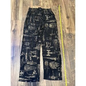 This product is a pair of Star Wars lounge pants in size medium, featuring a design inspired by the Millennium Falcon ship from the popular science fiction franchise. Made in China, these black and gold pants are a must-have for any Star Wars fan looking to add a touch of galactic style to their loungewear collection. Perfect for relaxation in comfort and style while showing off your love for the Star Wars universe.