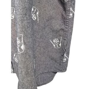 This Star Wars short-sleeved button-down shirt features an all-over Darth Vader Helmet print in white over a base color of medium gray.. There is a pocket on the left chest, and it has a button-down collar. The shirt has been very gently worn. At the time of photographing I noticed a flaw on the left bottom seam where there is some fraying, but no tear or hole. The shirt is in otherwise in VERY GOOD, PRE-OWNED CONDITION. It is a Men's Size XXL, but please refer to measurements below.