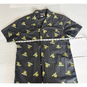 Official Star Wars men’s button-up shirt featuring an all-over print of Grogu (The Child / Baby Yoda). Charcoal characters, size Medium. Lightweight and perfect for casual fanwear, Disney trips, or collectors.