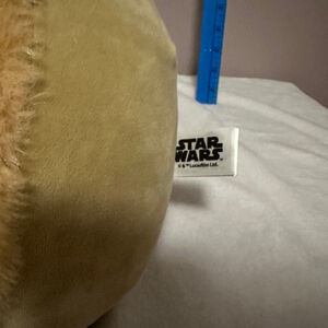 Pre-owned Star Wars Grogu plush toy, also known as Baby Yoda from The Mandalorian. Features a soft green head with large ears, embroidered eyes, and a slight smile. Brown robe design includes a faux-fur collar and smooth lower section. Perfect for Star Wars fans and collectors.