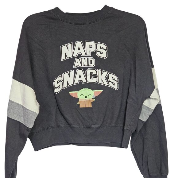 Star Wars sweatshirt, Grogu apparel, naps and snacks, crewneck pullover, casual wear, cotton blend top, medium size clothing, long sleeve shirt, cozy sweatshirt, relaxed fit top, cute graphic shirt, Mandalorian fashion, Star Wars gifts, Star Wars, Character, Cropped