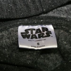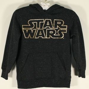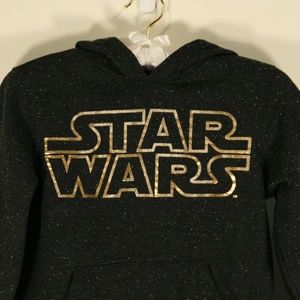This grey Star Wars hoodie features "Star Wars" graphic in gold! Designed without a hood drawstring (smart, because kids chew on everything!). EUC.