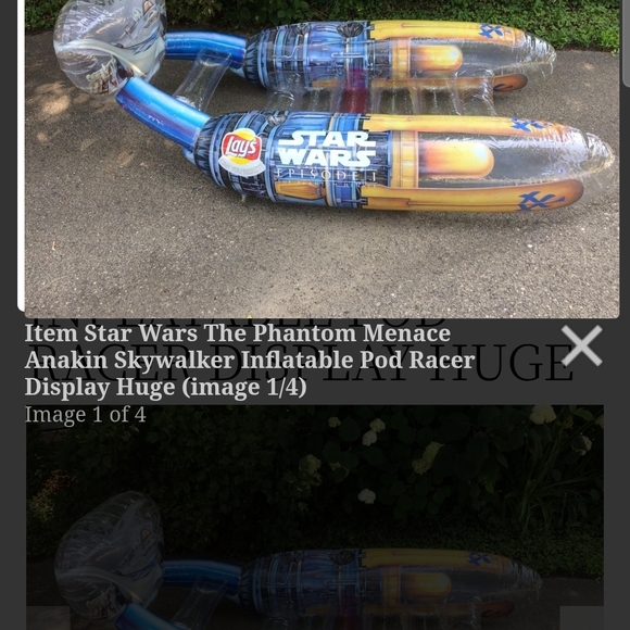 Huge Star Wars inflatable pod racer. Features vibrant blue and orange design. Perfect for display or collection. This was a display from Frito Lay. It's still in the original packaging unopened. I went on line to get the pictures and to try and get an idea on pricing. I found pictures but no prices. It's been in my basement for 25 years or so.