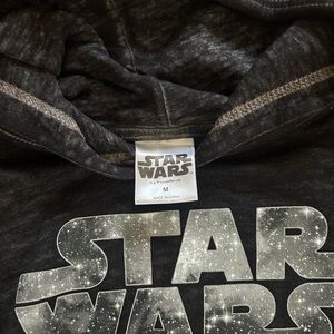 • Black pullover hoodie with silver galaxy Star Wars logo