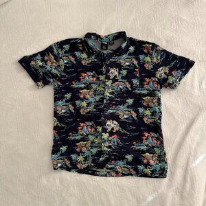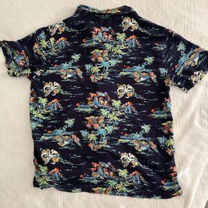 We could all use a vacation in the outer reaches of the galaxy... but sunbathing in the backyard with this shirt will do. Inspired by The Mandalorian, this tropical-printed woven button-up is perfect for lounging around in after a tough day of bounty hunting! Features a chest pocket and allover island pattern with the Child (often referred to as "Baby Yoda" and the mythosaur skull.