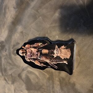 Bring the adventure of Star Wars into your home with this Mandalorian and Grogu tin . Featuring striking black and brown tones, this piece is perfect for fans of the series.