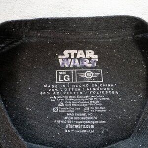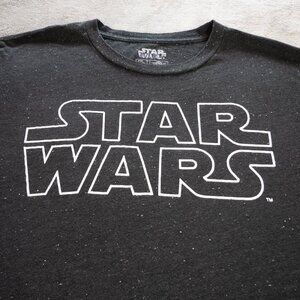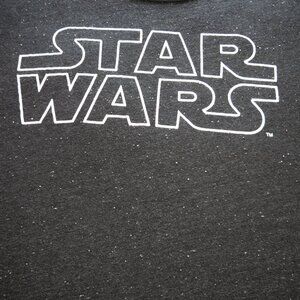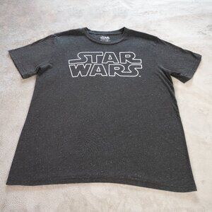 Classic Star Wars men’s graphic tee in dark heather gray with speckled design. Features bold logo print across the chest. Soft cotton blend, short sleeve style, casual fit. Size Large.