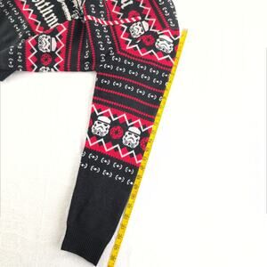 Embrace the dark side of the holidays with this playful Star Wars "Merry Sithmas" Ugly Christmas Sweater in Men's Size Large. The soft, comfortable acrylic knit is perfect for staying warm while looking festive. The sweater features the iconic Darth Vader wearing a Santa hat, holding a lightsaber, set against a classic Fair Isle style pattern of Stormtrooper helmets and Galactic Empire symbols. The bold colors—black, red, and white—make a strong statement.