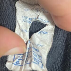 Pre-loved. There is a small hole on the right shoulder (see pointer). The brand/size tag is curled and torn. Not a perfect shirt but a cool find nonetheless.
