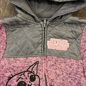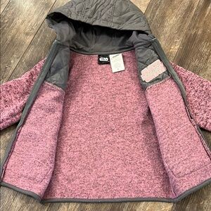 A vibrant pink jacket with a heathered texture, featuring a dark gray hood and chest panel. The black graphic design adds a playful touch.