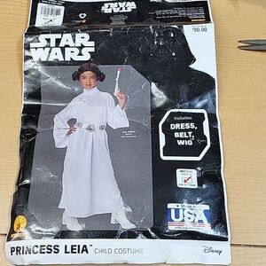 Dress up as your favorite Star Wars character with this Princess Leia 3-piece Halloween costume. The set includes a wig, dress, and belt, all in a women's medium size (8-10). Perfect for any Halloween or cosplay event, this costume is sure to make a statement. The dress features a unique style that will make you stand out from the crowd, while the wig and belt add the perfect finishing touches. Whether you're a fan of the classic trilogy or the latest films, this costume is a must-have for any Star Wars fan.