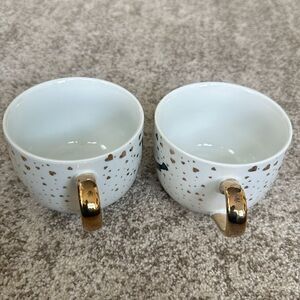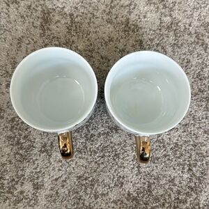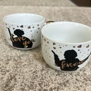 The two white mugs feature Leia and Han silhouettes surrounded by cute falling gold hearts with classy & fancy gold handles. The Princess Leia mug says "I love you" and the Han Solo mug says "I know."