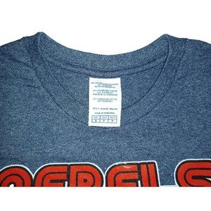 Shirt is a gray navy blue, with heather fabric, and is made of 50% Cotton, 50% Polyester. This is a Gildan brand shirt.