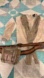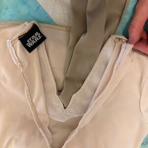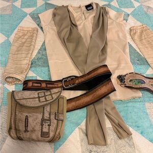 Rey Costume, from Star Wars The Force Awakens. Includes beige top with sewn-on sash, belt with pouch, fingerless gloves/arm sleeves, and eye mask. Top and belt have velcro closure. Belt has some wear in one area (see photo); set otherwise is in good condition. Just add brown or black pants/leggings to complete your costume. Great for Halloween & playing dress up.