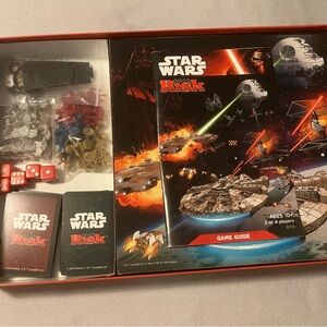 Star Wars Risk by Disney Hasbro. In great condition. All pieces are included. Only flaw is the bottoms of some of the pieces are labeled with a sharpie, as shown in the last photo.