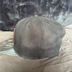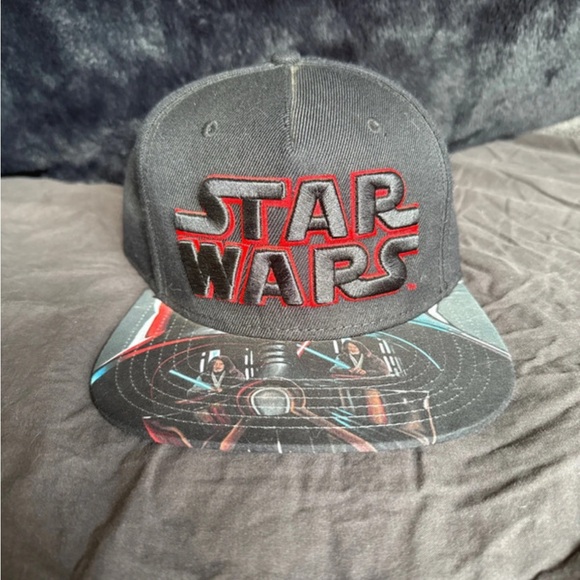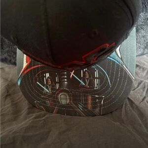 Star Wars SnapBack. Black cap and bill with Darth Vader and Obi Wan Kenobi sublimated on the top of the bill.