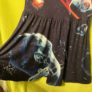 Black color. Stretchy material. Cap short sleeves. Scoopneck. Flared skirt. Featuring multiple spaceships.