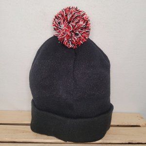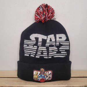 Star Wars winter ski hat in black with white logo, and character patch featuring Han, Chewie, R2, & C3PO. Pompom on top is red, white & black, and can be cut off if desired. 100% acrylic.