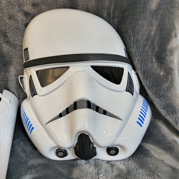 Transform into a Storm Trooper character with costume! Features white and black design with blue accents. Ideal for imaginative play.