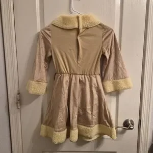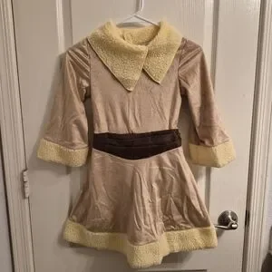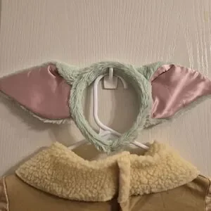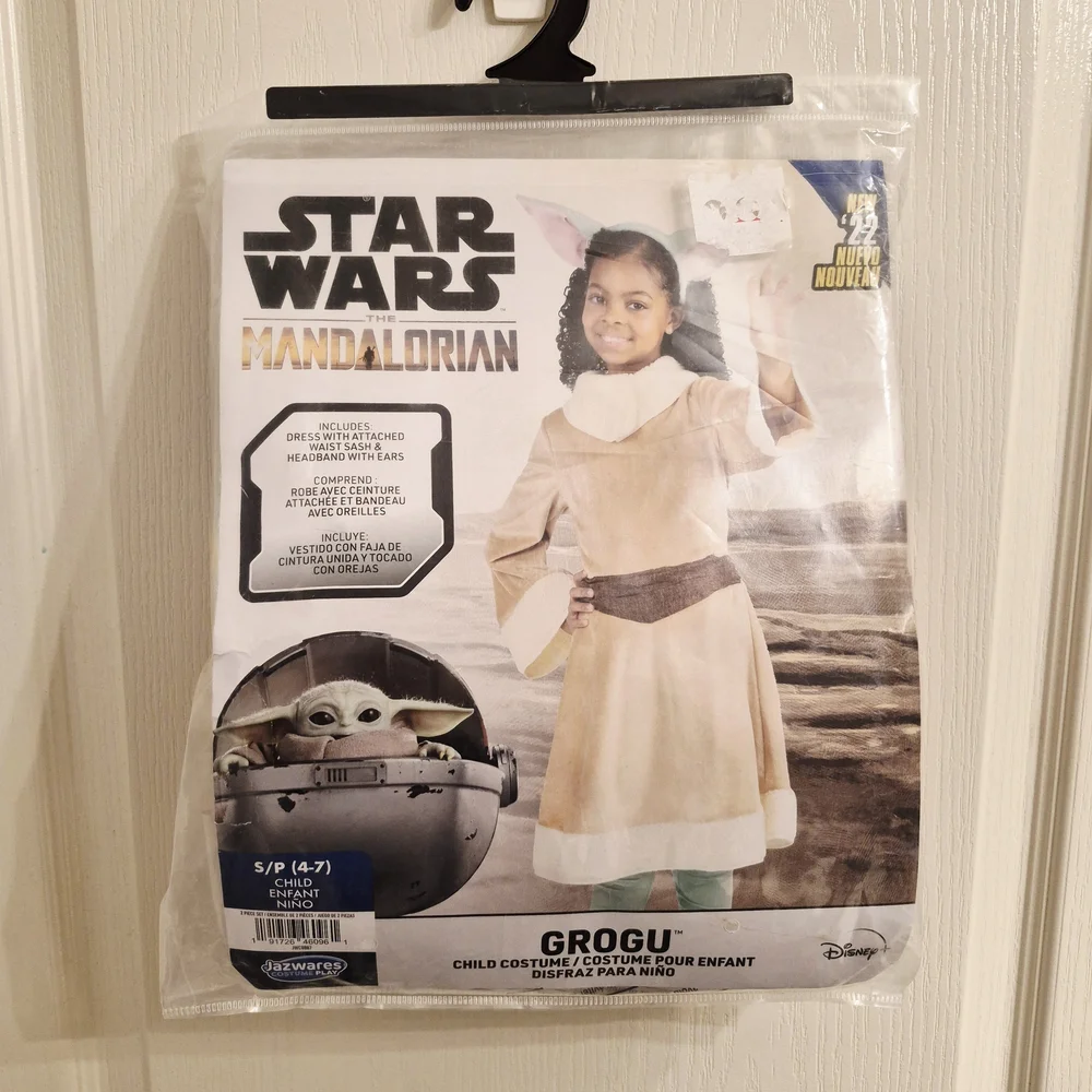 Official Star Wars The Mandalorian Grogu (Baby Yoda) costume in tan. Features a soft robe with attached collar and brown belt detail. Includes headband with ears for an authentic Grogu look. Comfortable, kid-friendly design ideal for imaginative play and Halloween. Size S (4 to 7). Wore once. A few runs on the robe. See last photo.