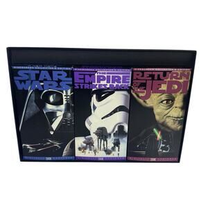 1995 Star Wars Trilogy VHS box set, THX Widescreen Edition. Includes digitally mastered versions of A New Hope, The Empire Strikes Back, and Return of the Jedi. Collector’s edition packaging featuring Darth Vader, Stormtrooper, and Yoda cover art. Outer box shows light shelf wear and scuffing (see photos), tapes in good condition.