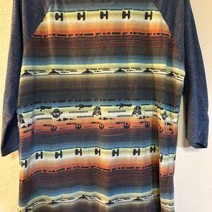 Cool multicolor shirt with 3/4 sleeves. 3 buttons at top and a pocket.