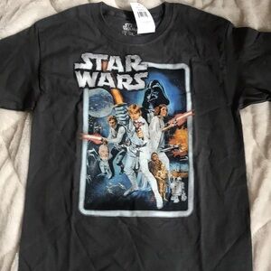 This is a cotton Tshirt with the Star Wars photo on the front. Great shirt. Child large, true to size.