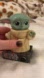 Charming Baby Yoda figure from Star Wars. Features a cute green and tan design. Perfect for young fans. As a button to press for the electronic voice and candy dispenser