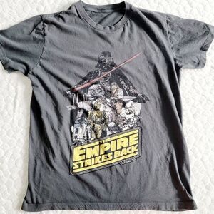 ****Star Wars retro Empire Strikes Back tee shirt. Size is missing...measures like a relaxed medium, maybe a fitted large? Please see measurements to see if it would work for you. Grey with broken-in, worn picture on front.****